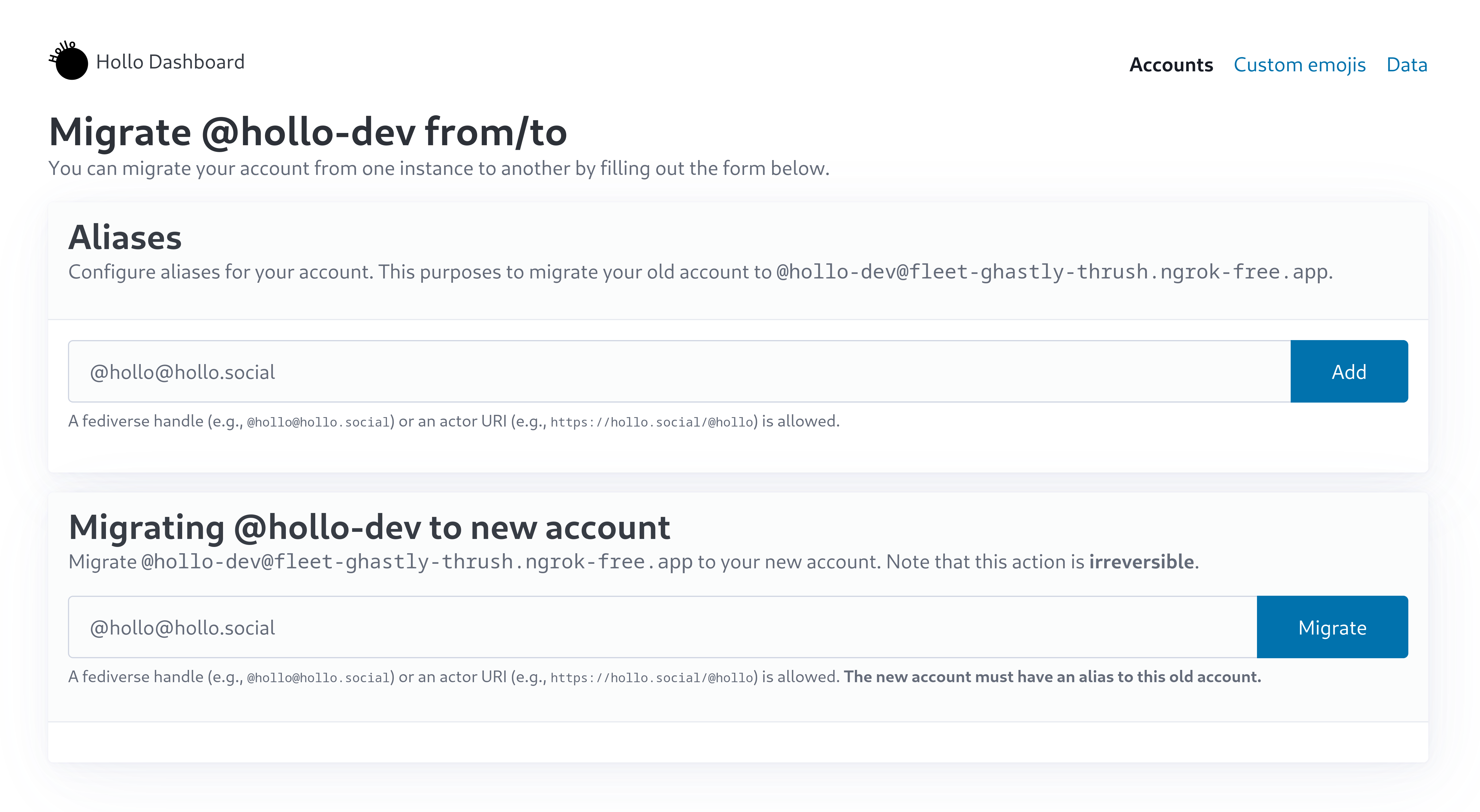 #Hollo finally lets you move your old account to new one! (FEP-7628 compliant.) It's bidirectional, which is basically equivalent to and interoperable with Mastodon's account move: