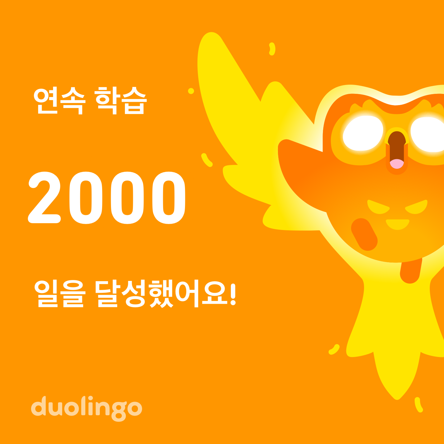 洪 民憙 (Hong Minhee)@hongminhee@hollo.socialDuolingo 連續(연속) 學習(학습) 2,000日(일)을 達成(달성)했어요! ALT text detailsDuolingo 連續 學習 2,000日을 達成했어요!