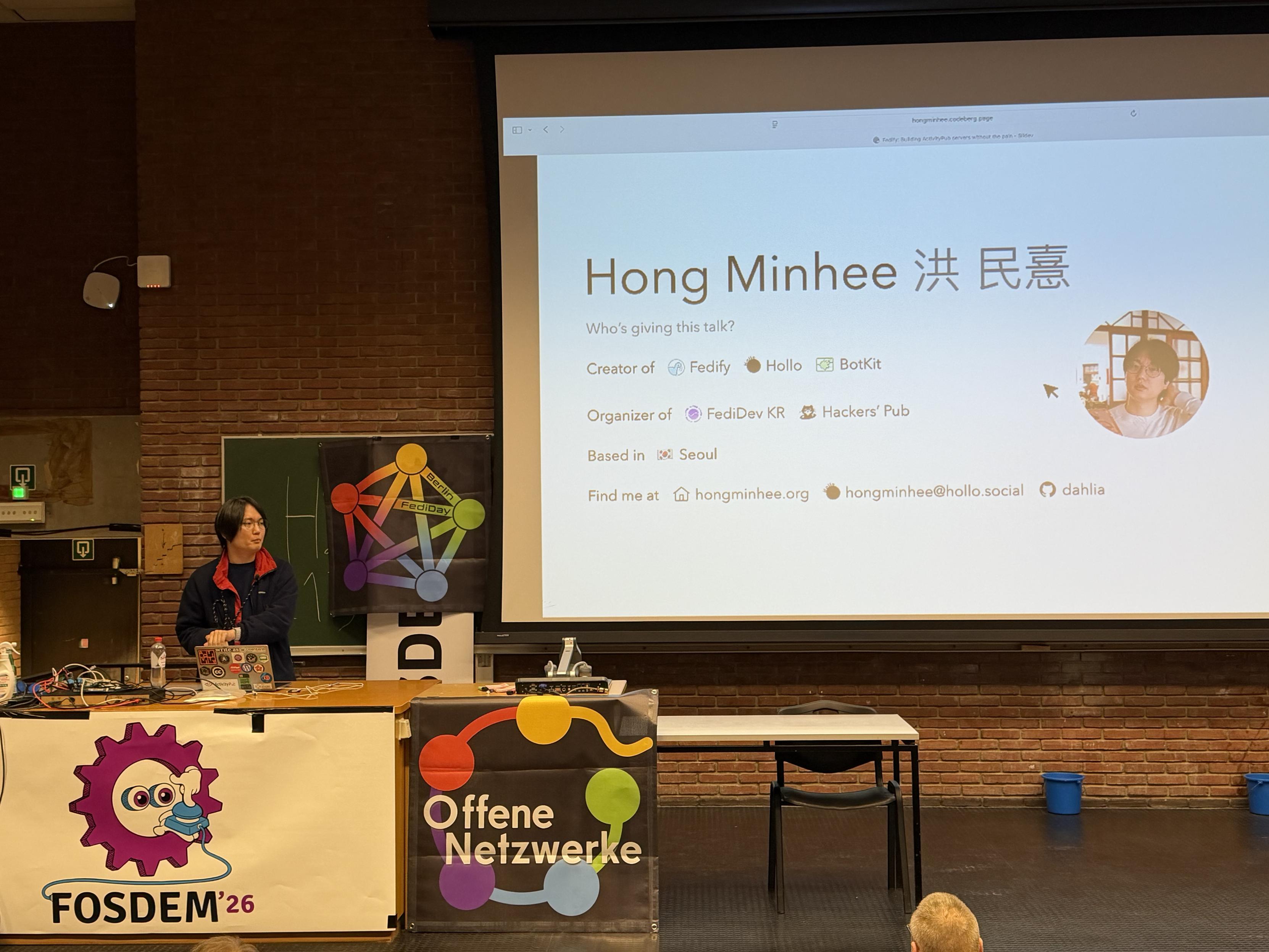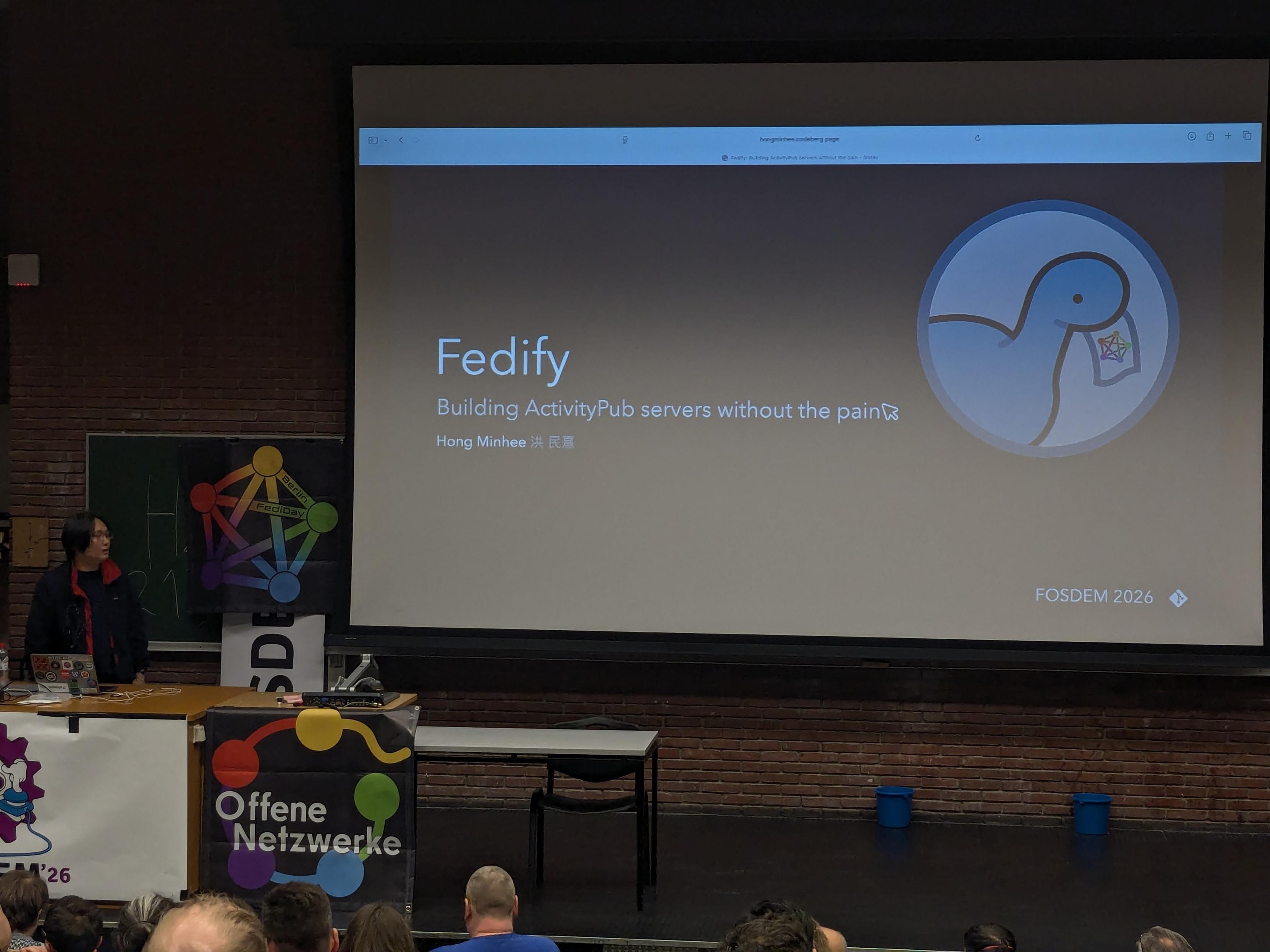 Thanks all for listening to my talk about #Fedify at #FOSDEM 2026 today! Here's my deck for the talk: Fedify: Building ActivityPub servers without the pain.