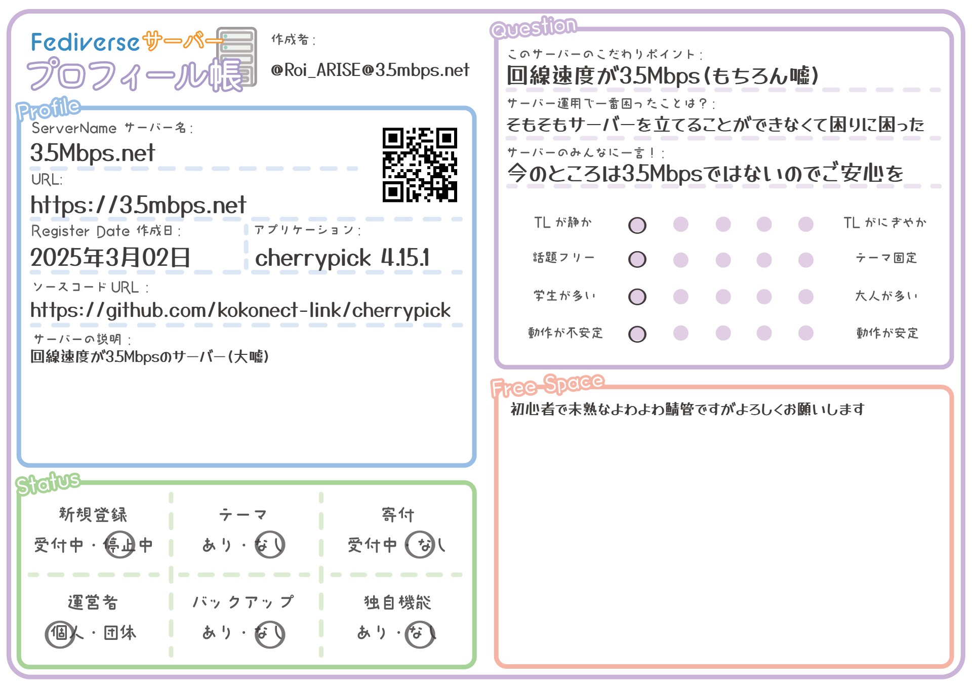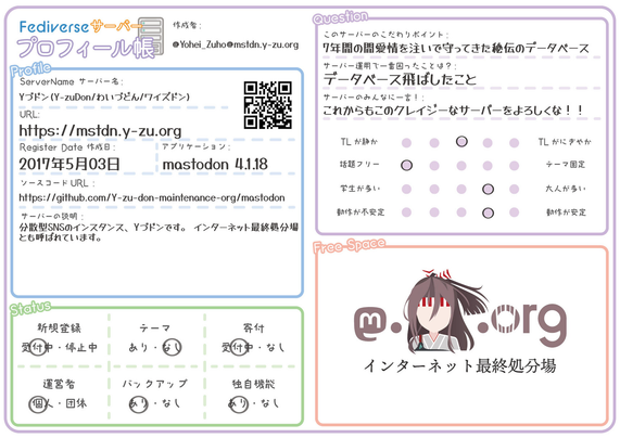 #Fediverseサーバープロフ帳 でプロフィールカードを作成しました! #okprint https://purofu.y-zu.org/view/server?id=173 #サーバープロフ帳 #サーバープロフィール帳 #サーバー紹介