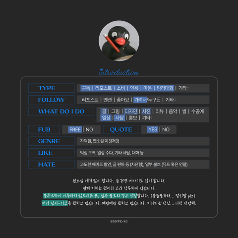 - 저를 구독하는 것보단 맞팔하는 것을 더 좋아합니다. 친구해요.