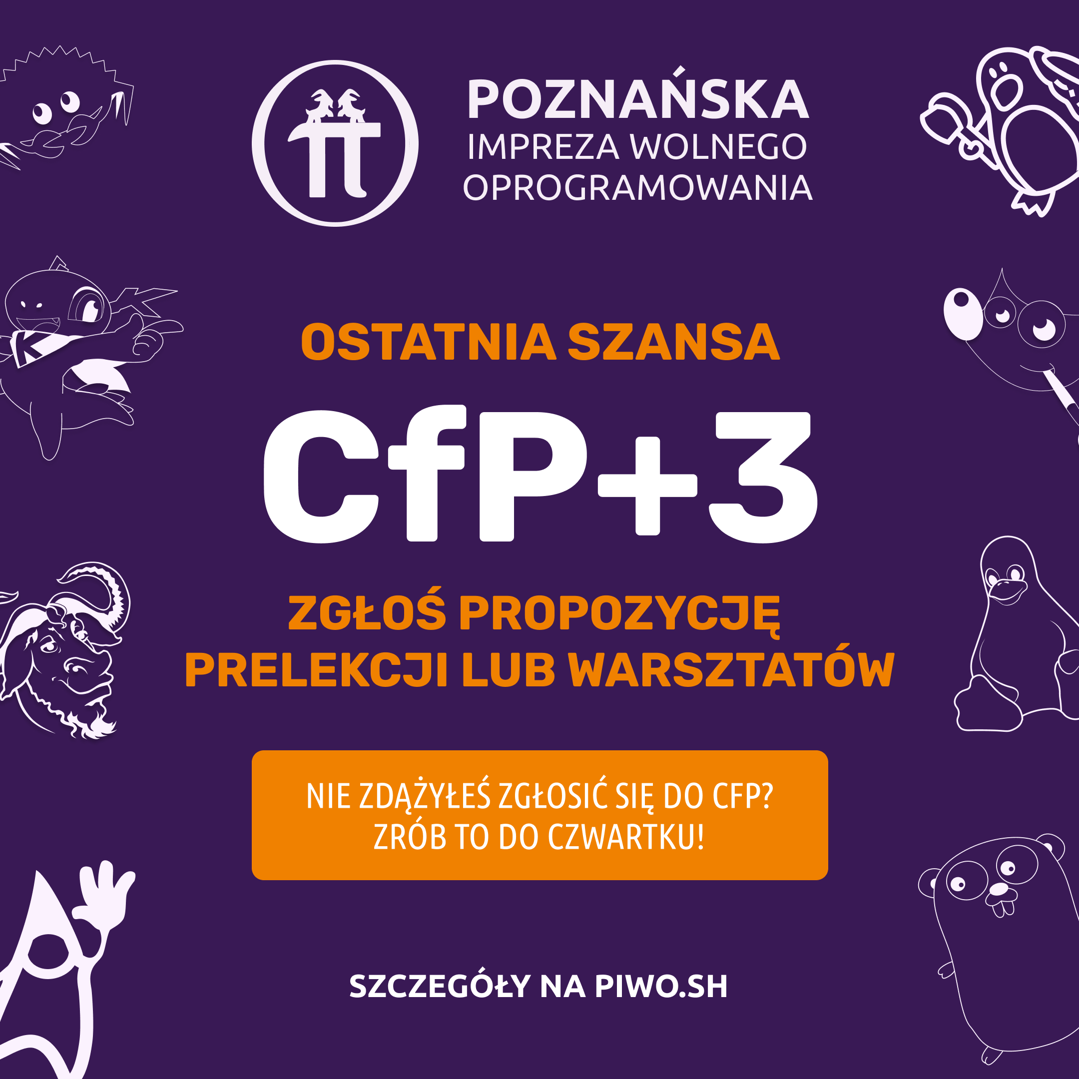 ALT text detailsGrafika w fioletowym tle z logo „Poznańska Impreza Wolnego Oprogramowania” u góry; duży pomarańczowy nagłówek „OSTATNIA SZANSA” i centralny biały napis „CfP+3”. Poniżej pomarańczowy tekst „ZGŁOŚ PROPOZYCJĘ PRELEKCJI LUB WARSZTATÓW” oraz pomarańczowy przycisk z napisem „NIE ZDĄŻYŁEŚ ZGŁOSIĆ SIĘ DO CFP? ZRÓB TO DO CZWARTKU!”. Na dole informacja „SZCZEGÓŁY NA PIWO.SH”. Po bokach dekoracyjne, kreskówkowe maskotki ze świata open source.