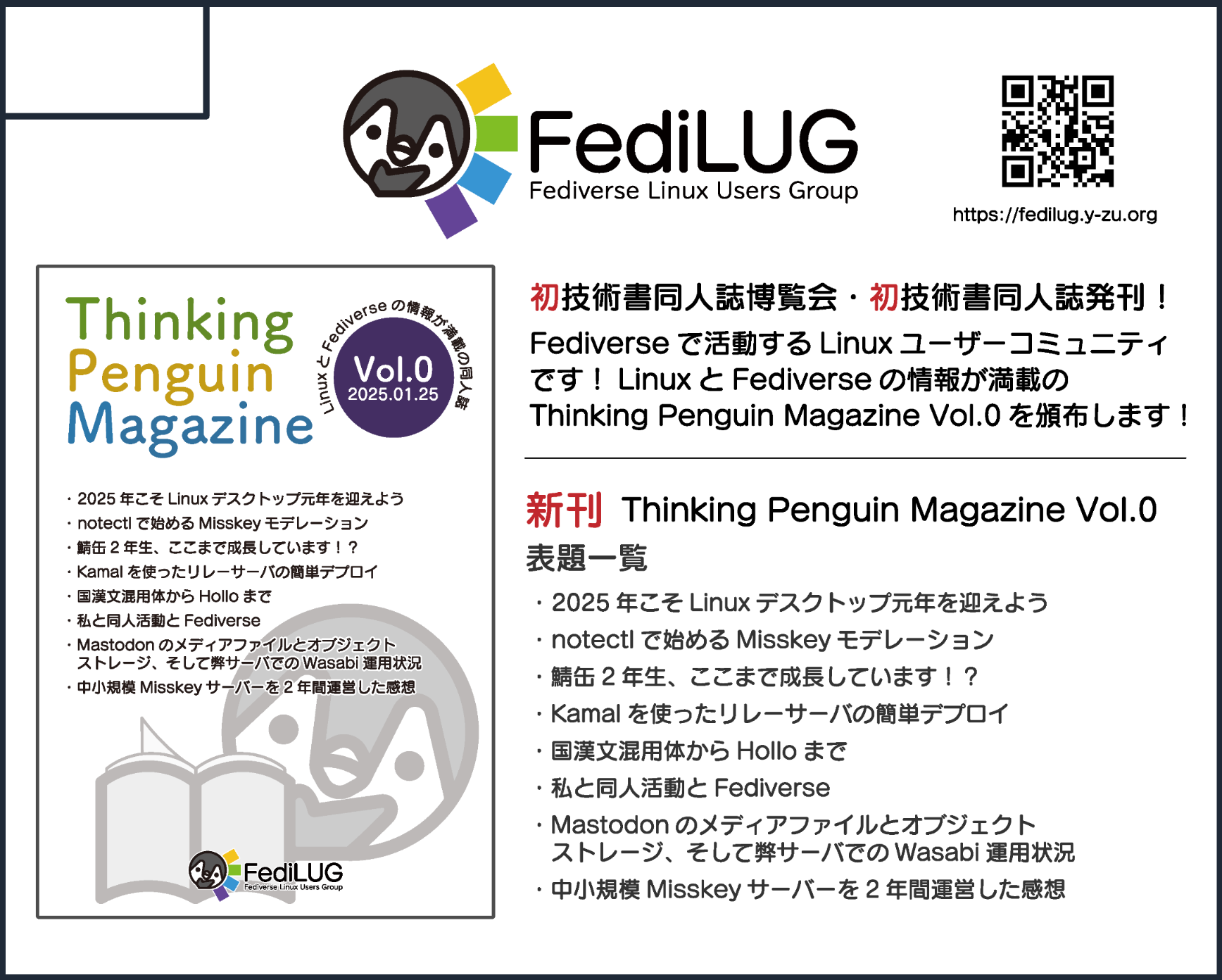 概要:FediverseおよびLinuxに関連した技術・コミュニティについて扱う同人誌