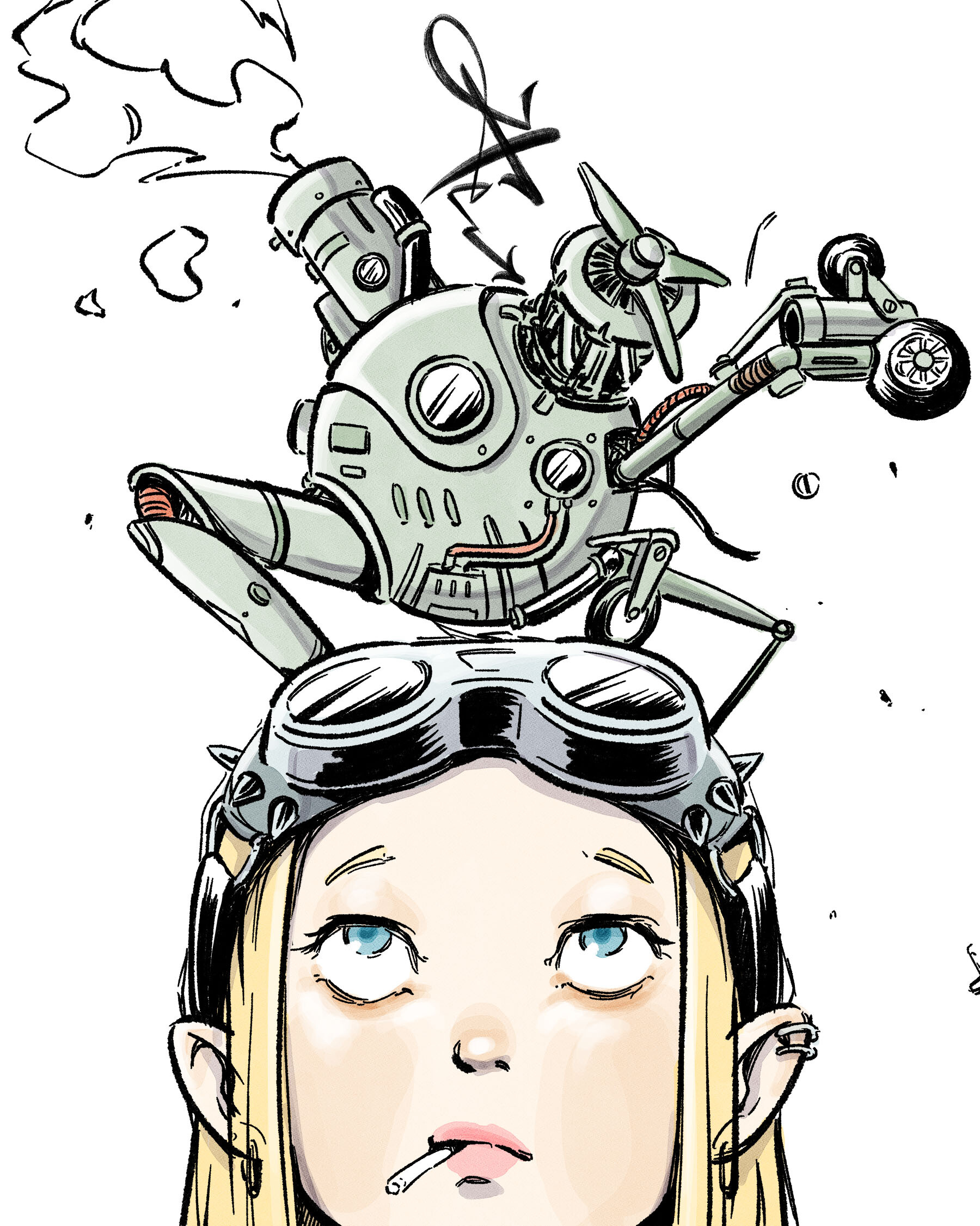 ALT text detailsIllustration of a small armored robot sitting on top of a girl’s head. The robot features a detailed mechanical body, while the girl wears steampunk goggles.