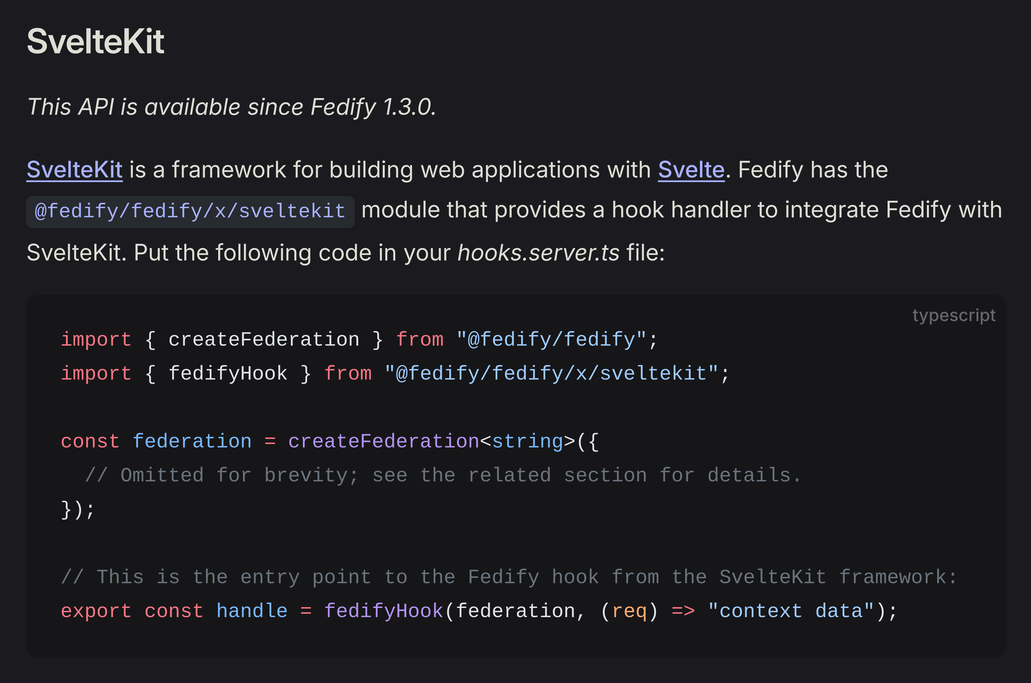 This package provides a middleware called integrateFederation() that allows you to integrate #Fedify with #Express: