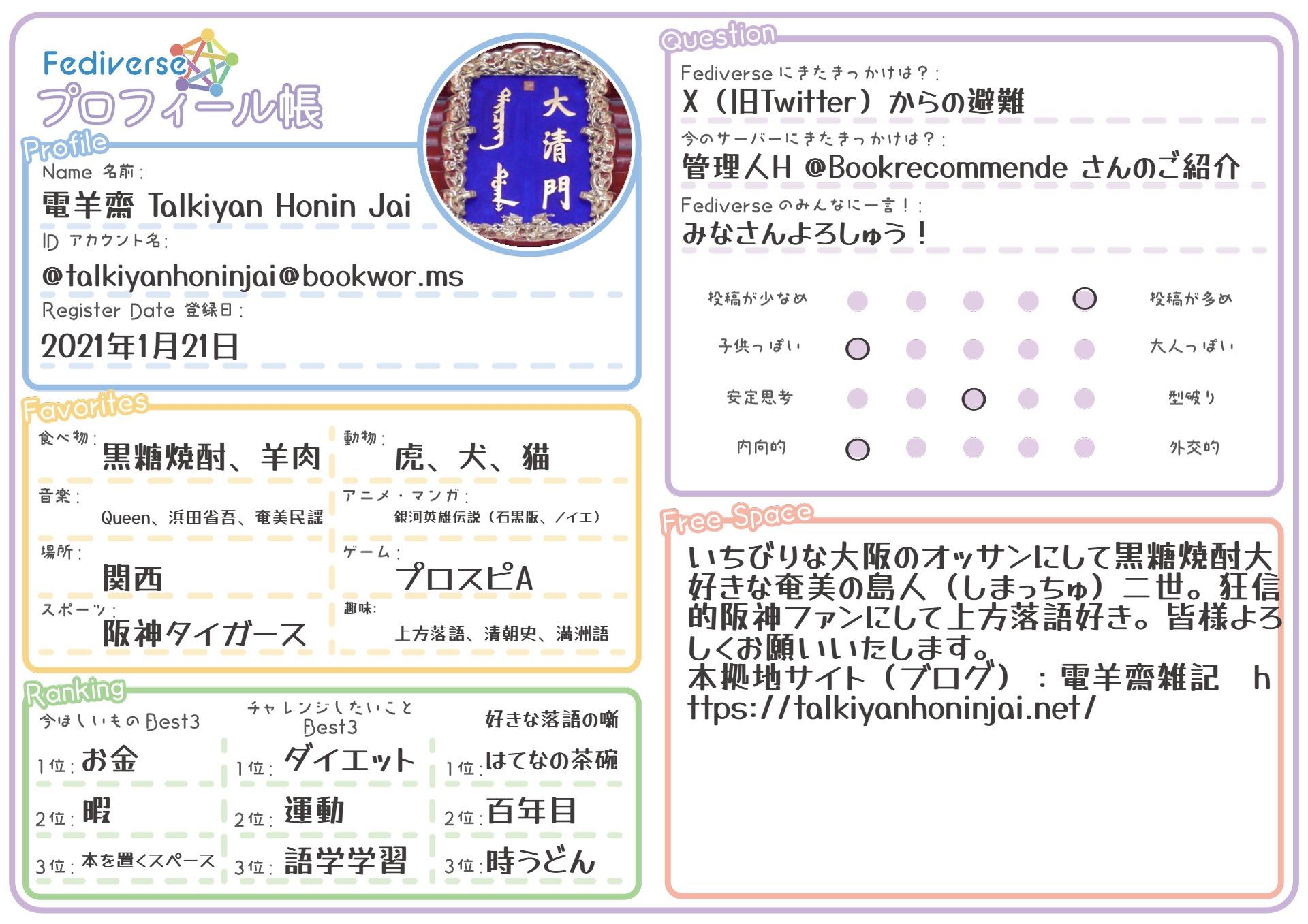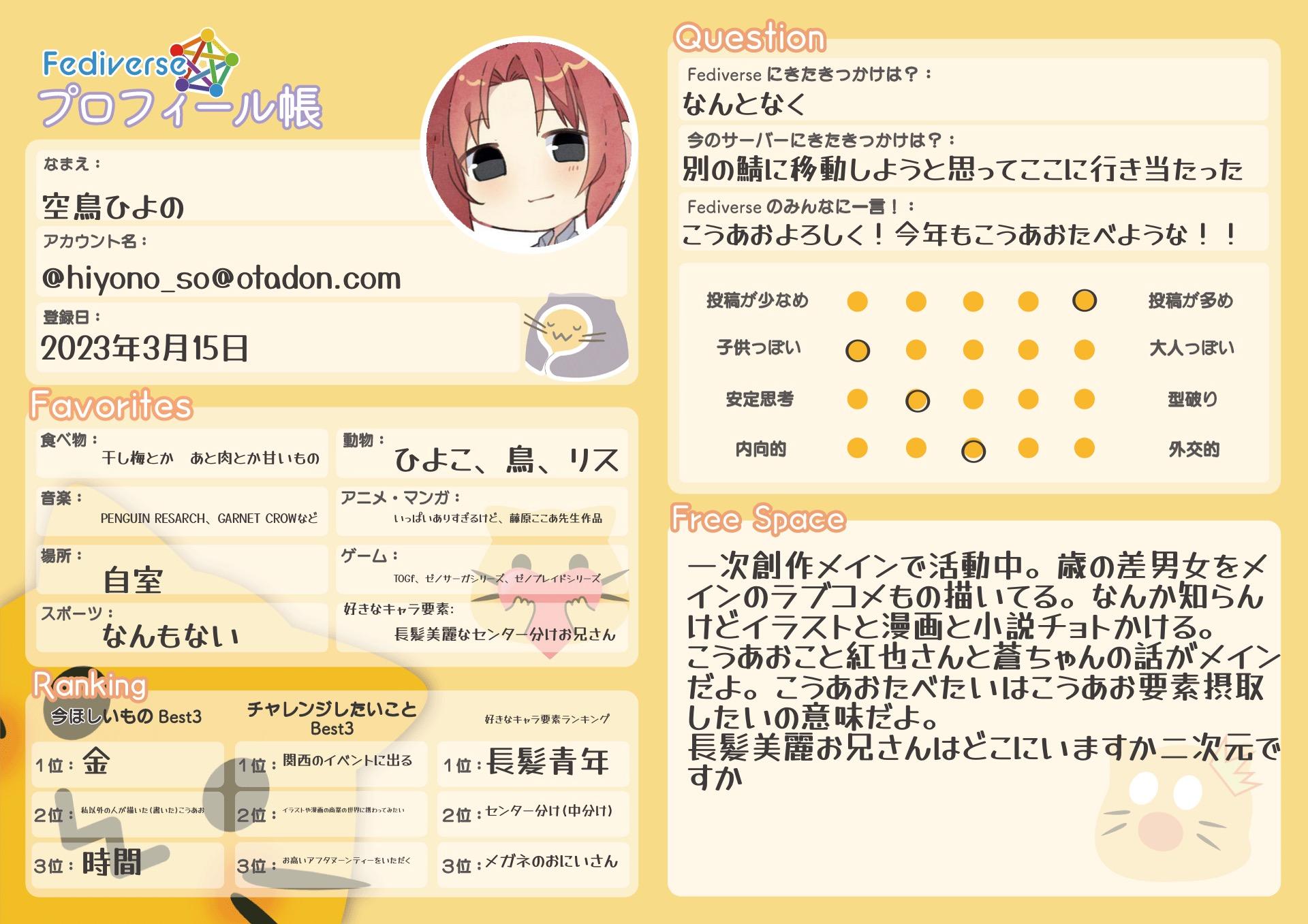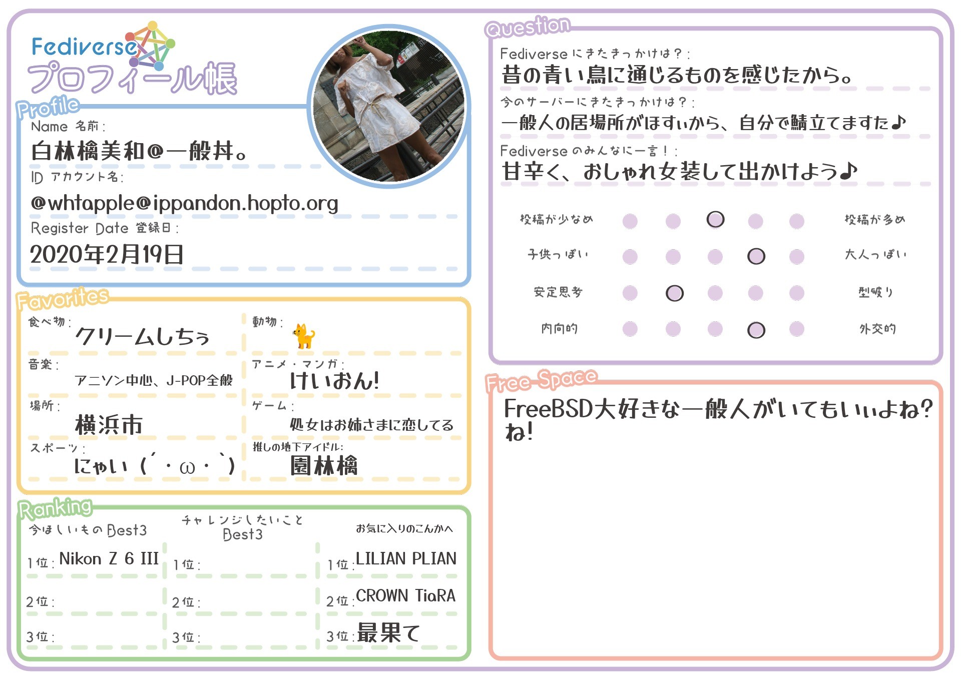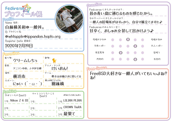 #Fediverseプロフ帳 でプロフィールカードを作成しました! https://purofu.y-zu.org/view/card?id=201 #プロフ帳 #プロフィール帳