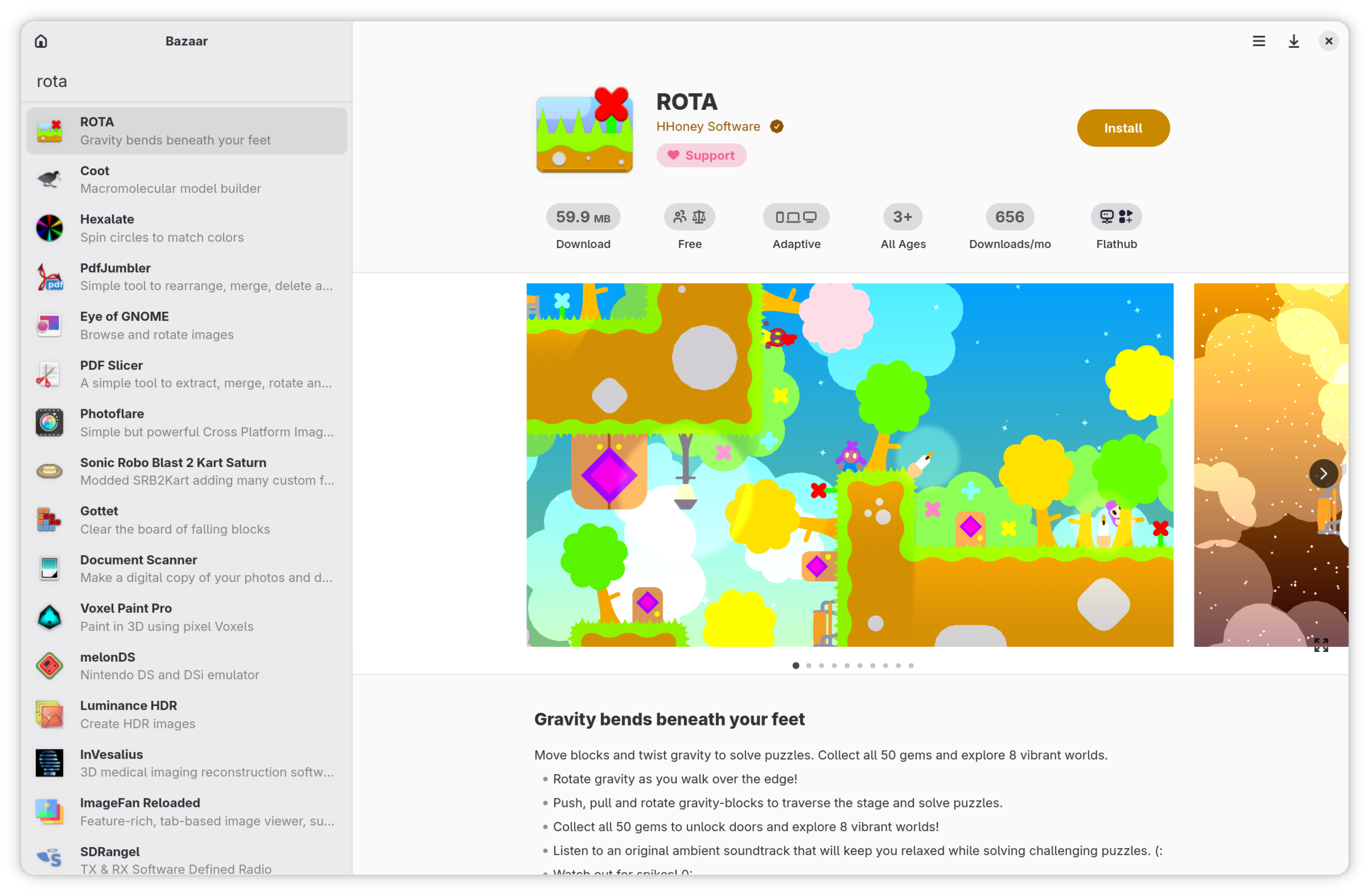 ALT text detailsScreenshot of Bazaar, an app store, with a listing for the game ROTA. It shows all of the app store things how you would expect, including a big icon, a verified developer name, a button to support the developer, a big install button, install size, age rating, big screenshots, and a nicely formatted description. On the left is a sidebar for the search with other results for the search "rota".