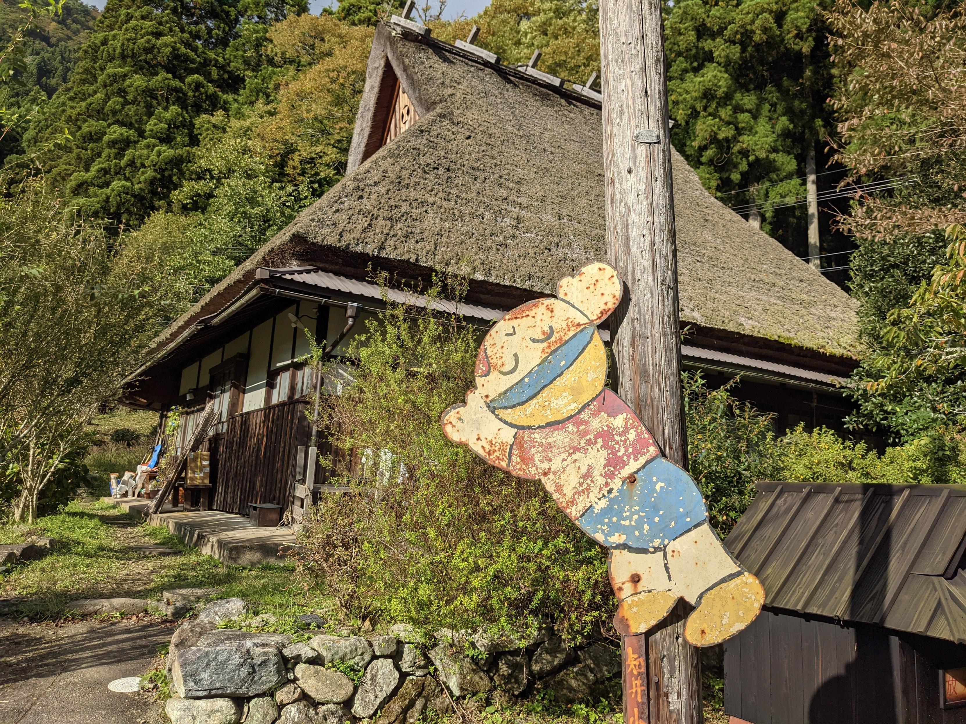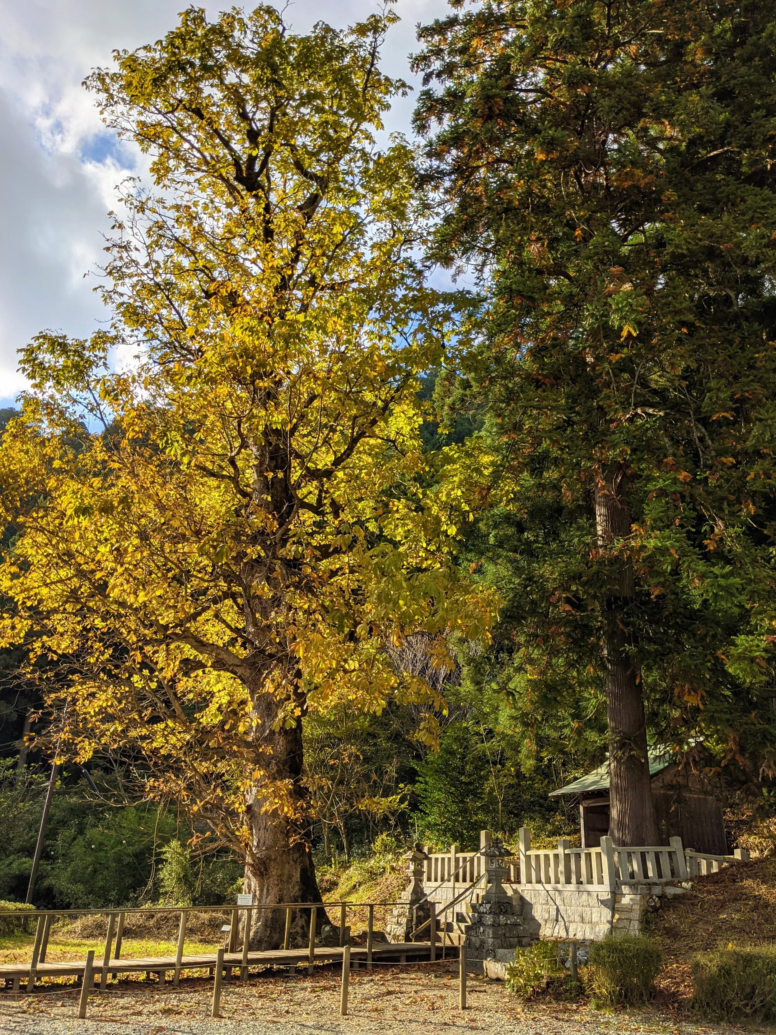 A 400-year old horse-chestnut tree (トチノキ) soars above Kayabuki-no-sato's (かやぶきの里) Inari-jinja (稲荷神社).