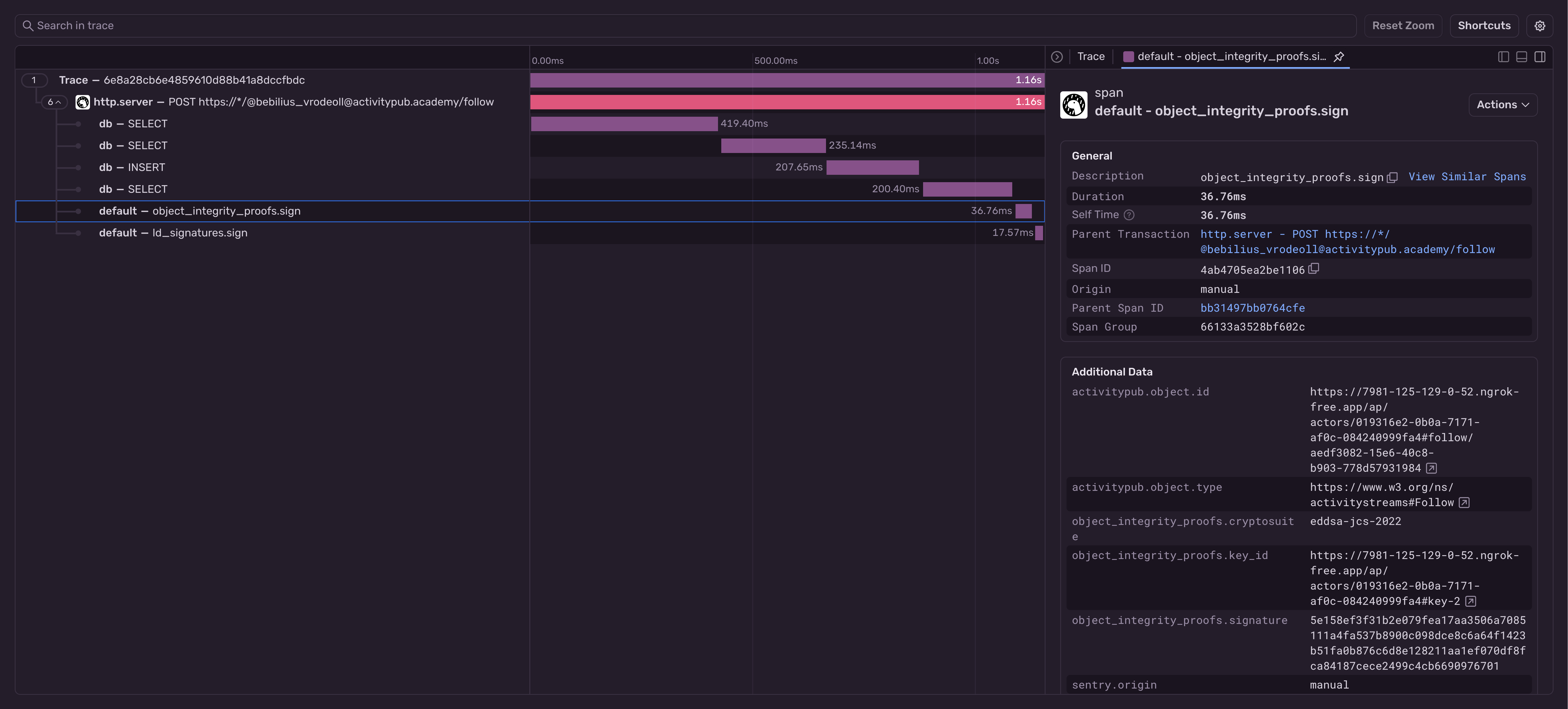 activitypub.fetch_document span for document loader operations, tracking URL fetching, HTTP redirects, and final document URLsactivitypub.verify_key_ownership span for cryptographic key ownership verification, recording actor ID, key ID, verification result, and the verification method used