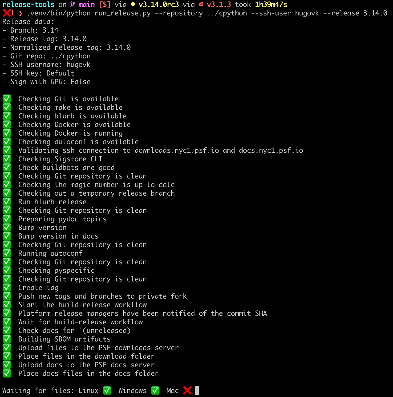 Now start run_release.py, the main release automation script, which does a bunch of pre-checks, runs blurb to create a merged changelog, bumps some numbers, and pushes a branch and tag to my fork. It'll go upstream at the end of a successful build.