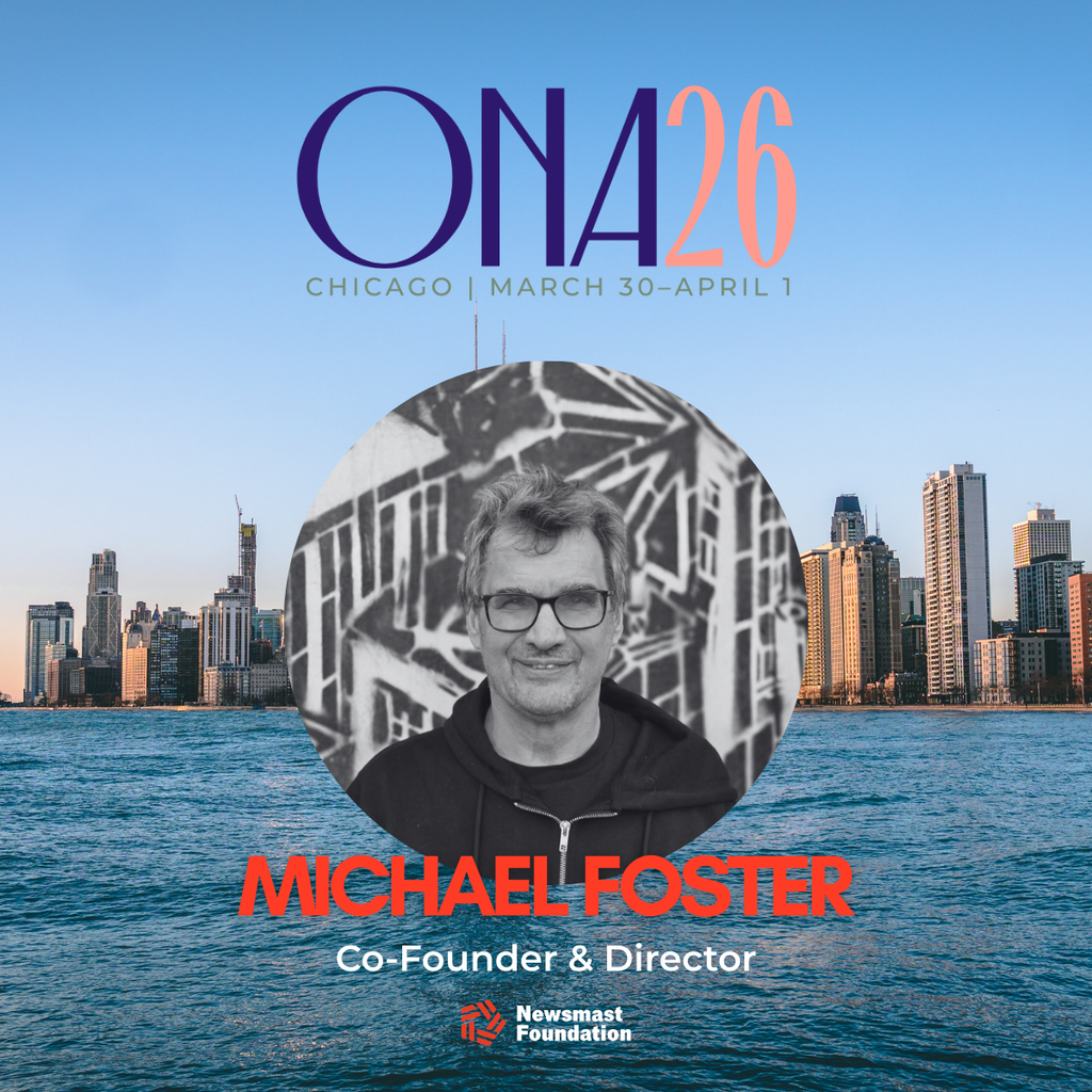 The text on the image reads: ONA26 Chicago March 30-April 1. Michael Foster. Co-founder and director Newsmast Foundation.