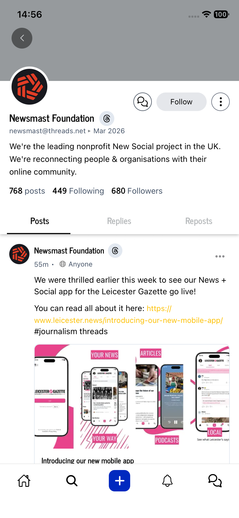 ALT text detailsA screenshot of a Newsmast Foundation client app. It shows a Threads account profile, with the Threads symbol besides the display name.