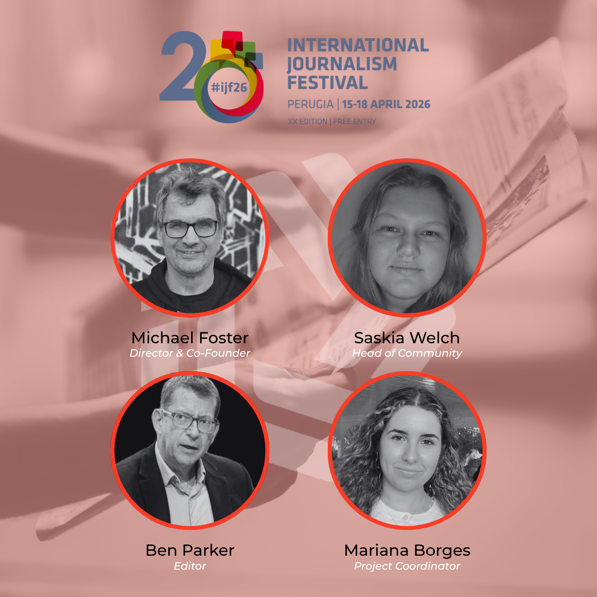 ALT text detailsA graphic which shows the Newsmast Foundation team, Michael Foster (Director & Co-Founder), Saskia Welch (Head of Community), Ben Parker (Editor), Mariana Borges (Project Coordinator). It says they're going to attend the International Journalism Festival, Perugia 15-18 April.