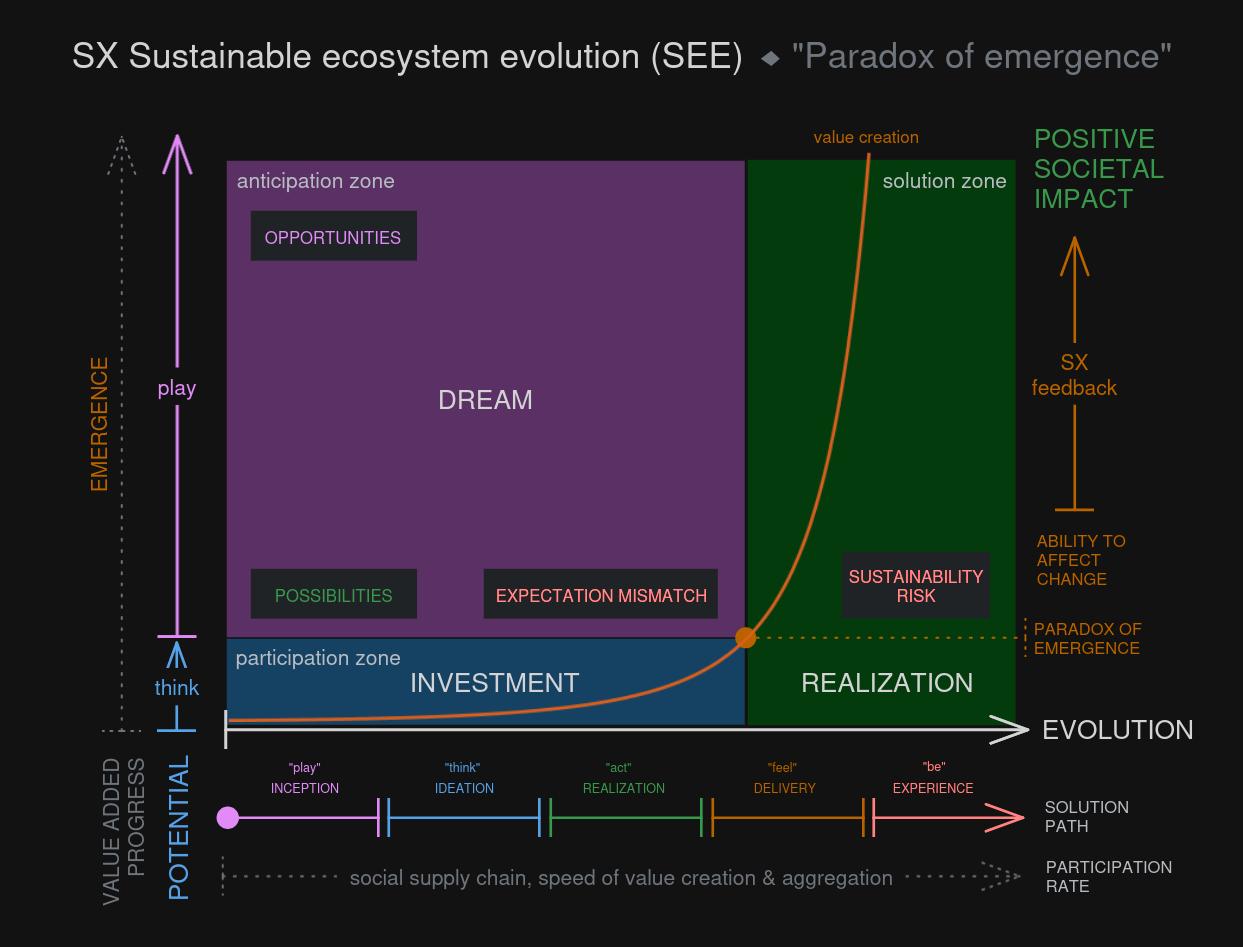 The paradox is solved at an inflection point along the evolution axis of the solution, called appropriately 'the paradox of emergence' point, when actual value is demonstrated by positive societal impact that grows via SX feedback loops. This is the solution zone, the full right side of the diagram, where value creation can grow exponentially and dreams turn to their realization. Now there are sustainability risks to healthy evolution to monitor well.