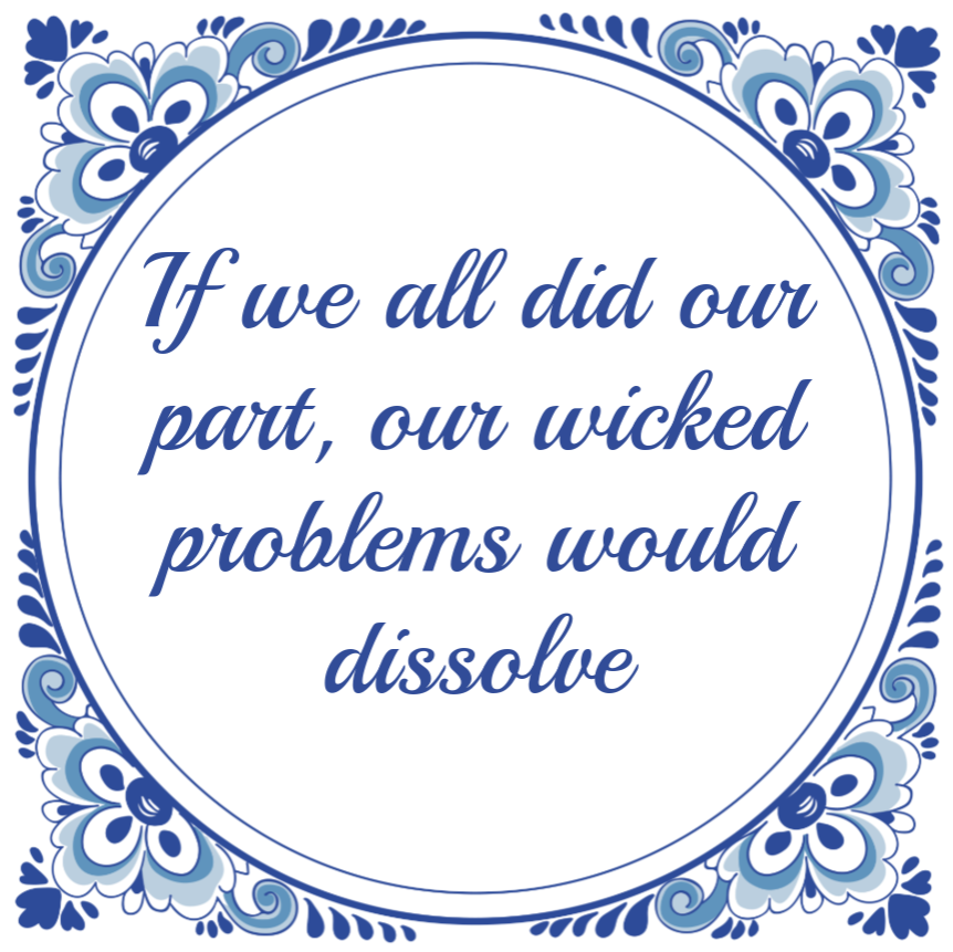 ALT text detailsDelft-blue wisdom tile, reading "If we all did our part, our wicked problems would dissolve".