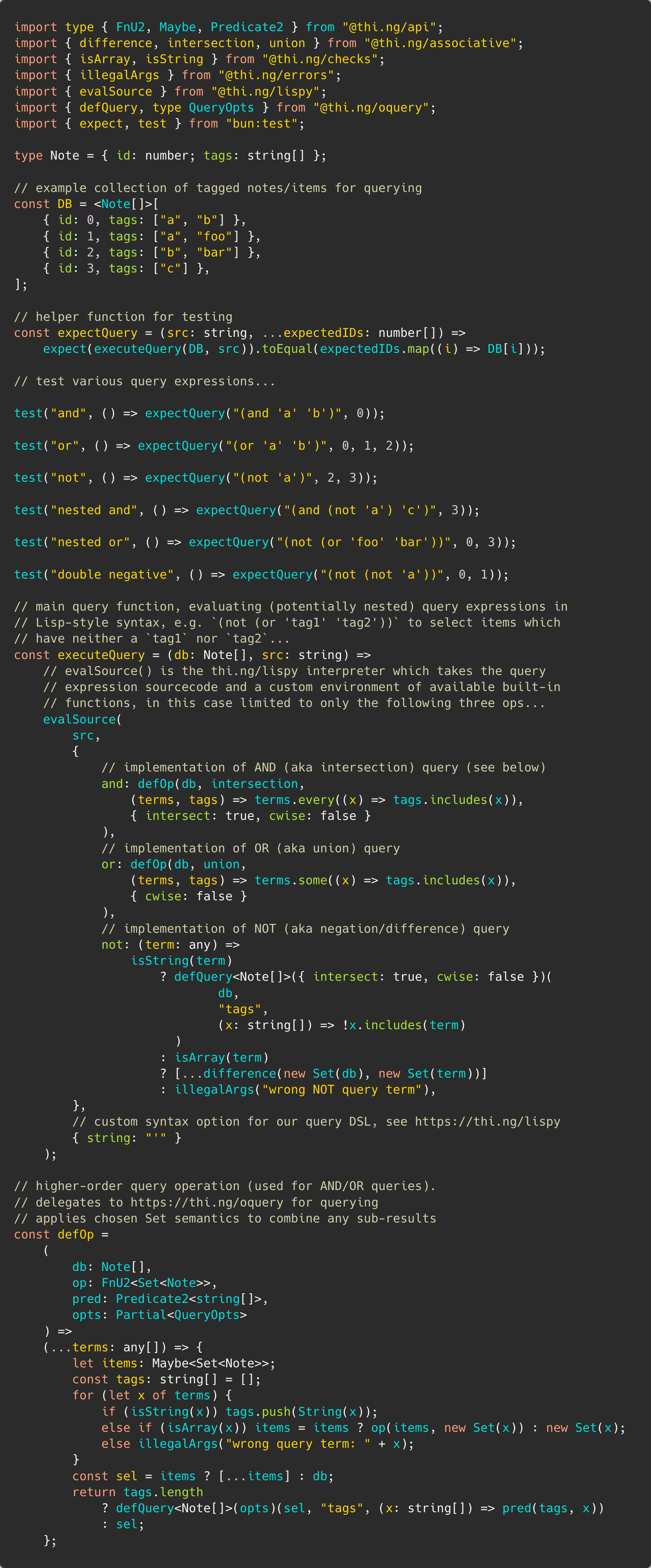 Below is a simple query engine to do just that in ~40 lines of code (sans comments), incl. using an extensible interpreter for a simple Lisp-like S-Expression language to define arbitrarily complex nested tag queries (the code is actually lifted & simplified from my personal knowledge graph tooling, also talked about here recently[1]...)