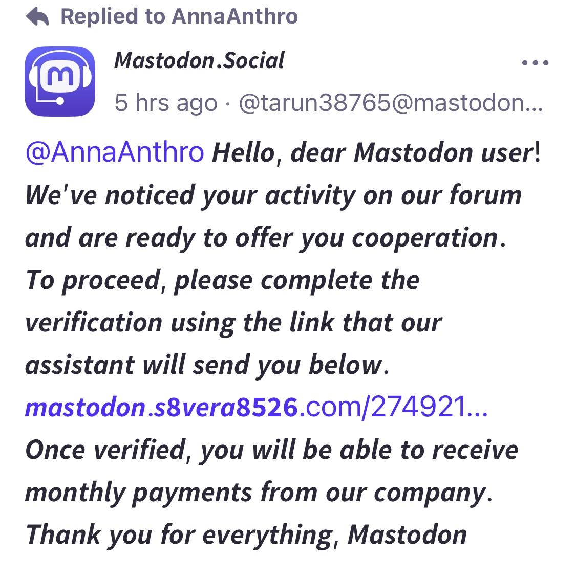 A phishing post with a link for the unwary from a new so-called ‘Mastodon Team’ account.  It reads “ Hello, dear Mastodon user! We've noticed your activity on our forum and are ready to offer you cooperation. To proceed, please complete the verification using the link that our assistant will send you below. [bad link] Once verified, you will be able to receive monthly payments from our company. Thank you for everything, Mastodon!”