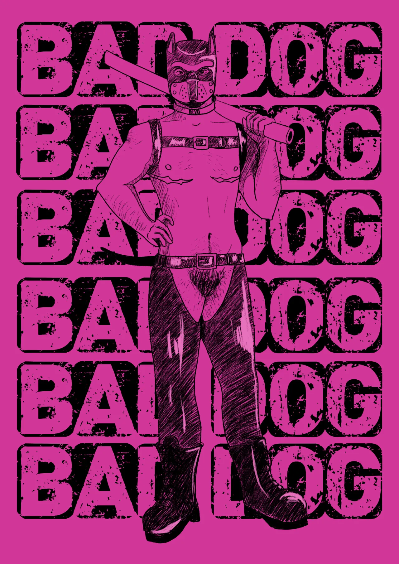 A sketch illustration of a transman leather pup standing in front of the words "bad dog" in all caps repeated down the length of the illustration. The character is wearing a leather pup hood, bulldog style harness, leather chaps and boots. He's also holding a metal pipe resting over one shoulder like one would hold a baseball bat. The sketch is done in black with a hot pink as the background color.