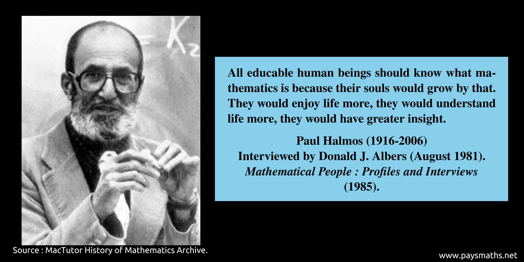 "All educable human beings should know what mathematics is because their souls would grow by that. They would enjoy life more, they would understand life more, they would have greater insight." – Paul Halmos (1916-2006)
